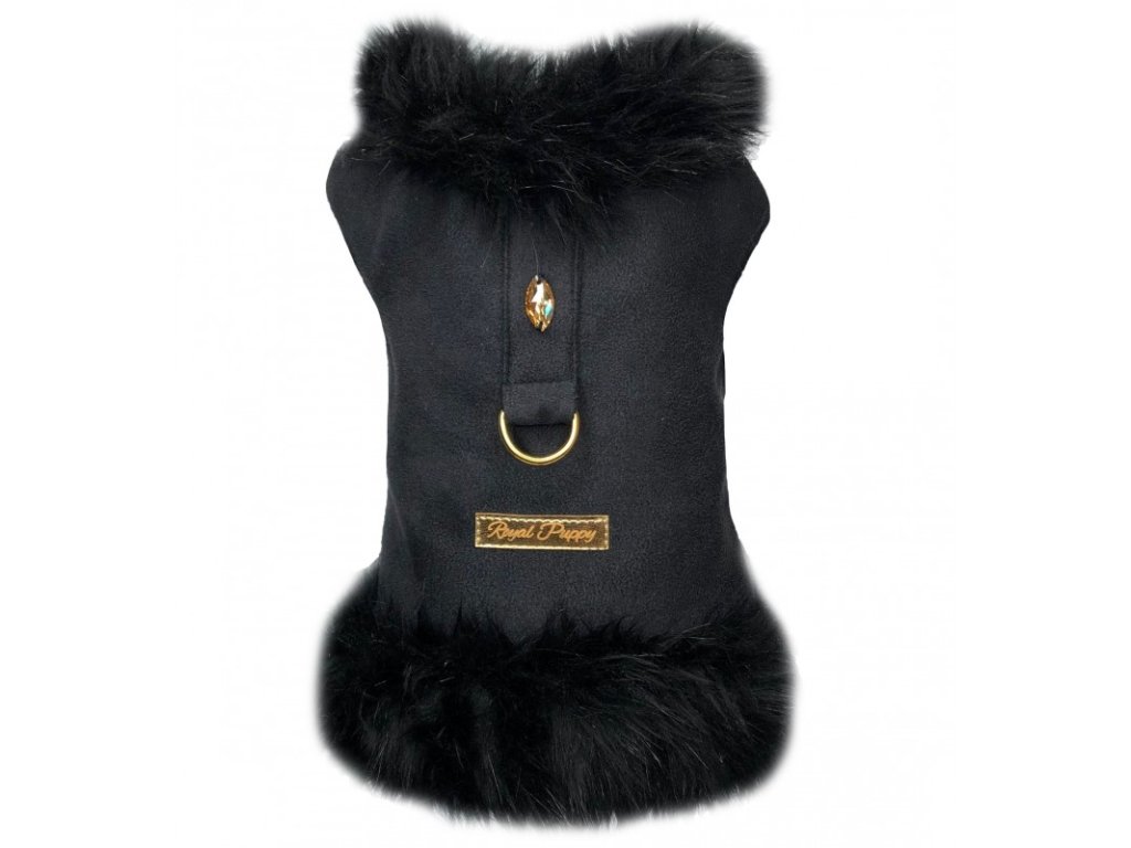 Luxusní vesta z kolekce Glori z kvalitního černého semiše, zevnitř zateplené měkkou a příjemnou látkou Minky. Jejich šik a eleganci podtrhuje zlatý krystal od Swarovski Crystals® a lem z neuvěřitelně husté černé kožešiny. Je to model, který si zamiluje každý mazlíček i jeho majitel. Díky poutku na vodítko nepotřebujete kšíry ani obojek.