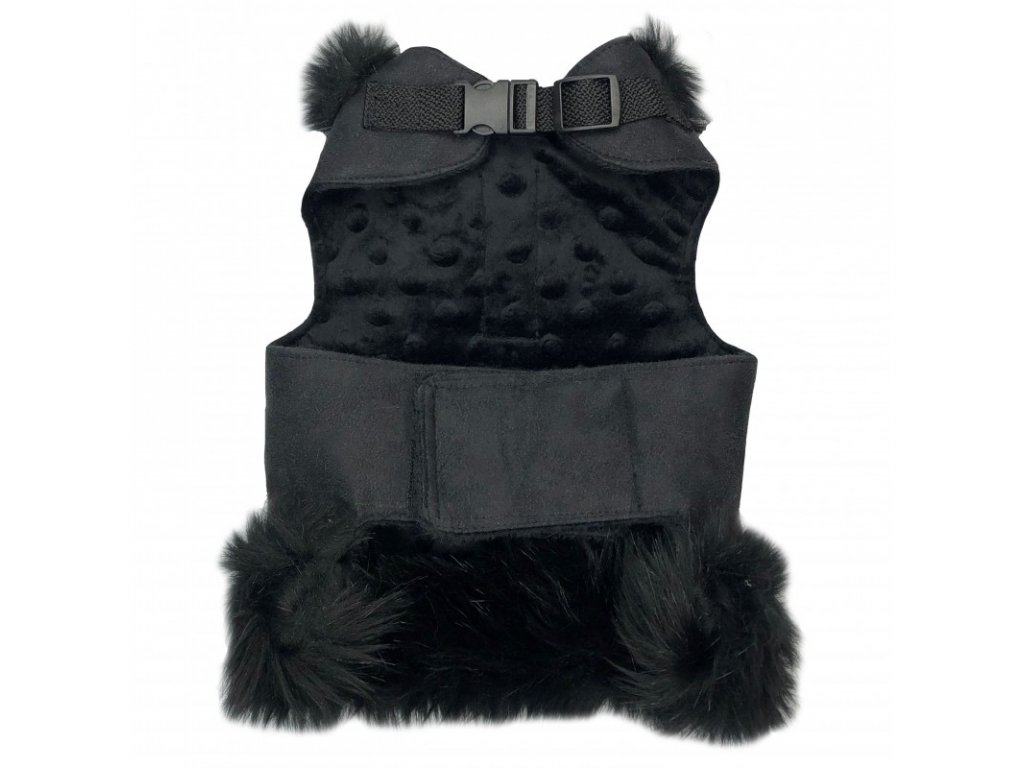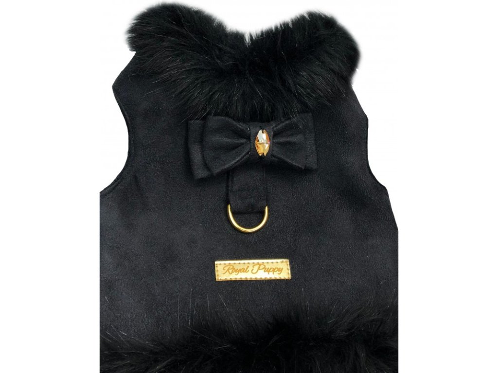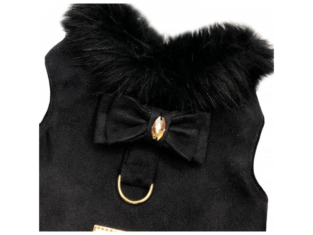 Luxusní vesta z kolekce Glori z kvalitního černého semiše, zevnitř zateplené měkkou a příjemnou látkou Minky. Jejich šik a eleganci podtrhuje okouzlující mašle zdobená zlatým krystalem od Swarovski Crystals® a lem z neuvěřitelně husté černé kožešiny. Je to model, který si zamiluje každý mazlíček i jeho majitel. Díky poutku na vodítko nepotřebujete kšíry ani obojek.