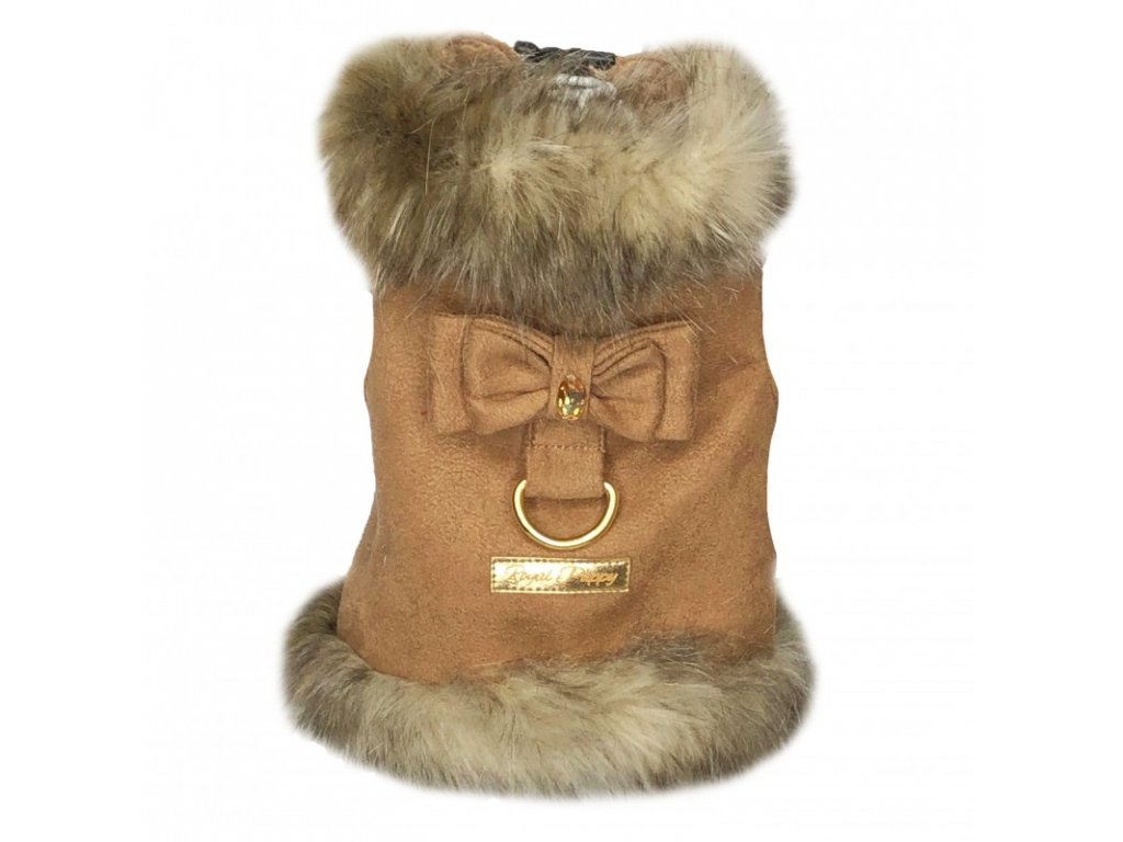 Luxusní vesta z kolekce Glori z kvalitního hnědého semiše, zevnitř zateplené měkkou a příjemnou látkou Minky. Jejich šik a eleganci podtrhuje okouzlující mašle zdobená zlatým krystalem od Swarovski Crystals® a lem z neuvěřitelně husté kožešiny v odstínech hnědé a béžové. Je to model, který si zamiluje každý mazlíček i jeho majitel. Díky poutku na vodítko nepotřebujete kšíry ani obojek.