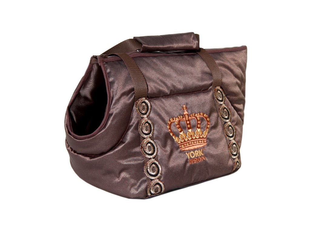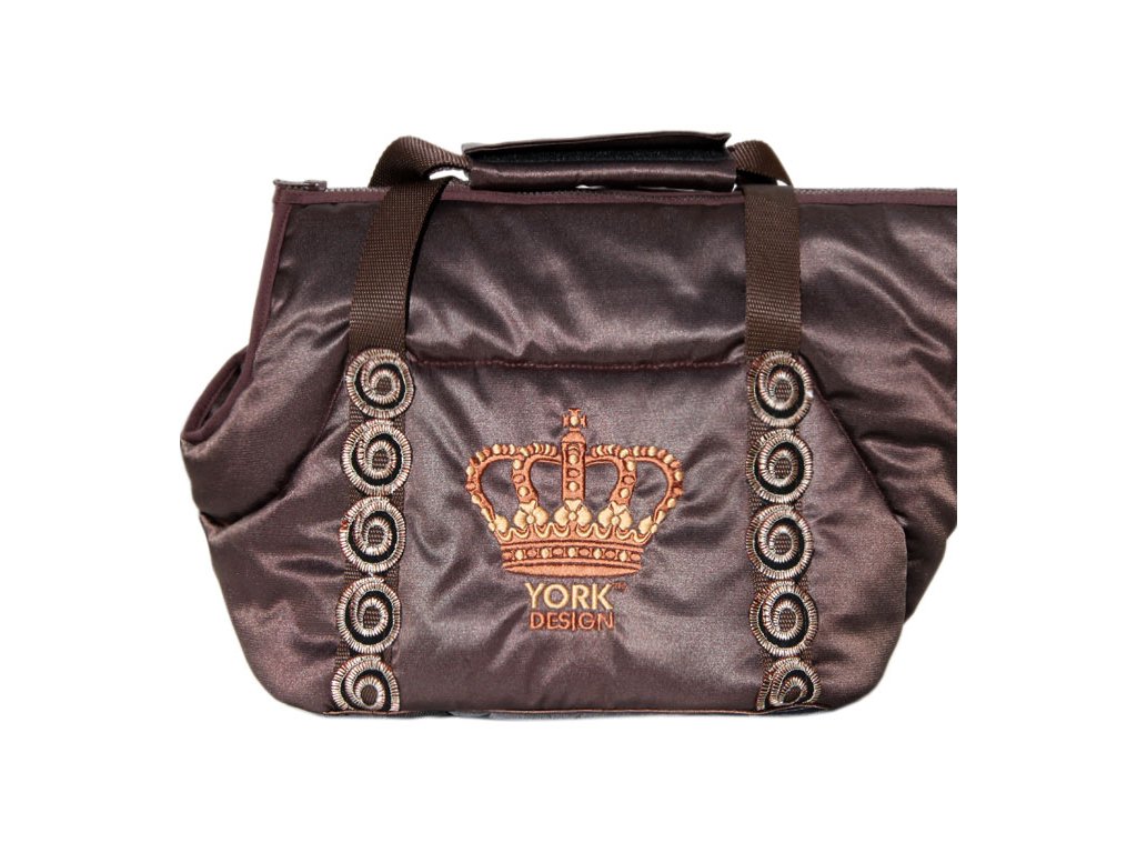Taška pro psy zn. York Design je vyrobena z jemně lesklého materiálu, který je lehce omyvatelný. Tašku zdobí vyšitá královská koruna. Uvnitř tašky je karabina pro uchycení pejska za kšíry.
