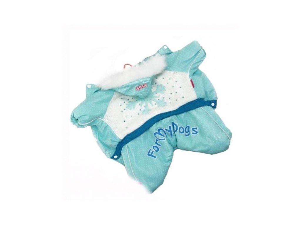 Luxusní zimní kombinéza Snowflake v tyrkysovo-bílé barvě vypadá skvěle a je precizně zpracována. Kombinéza se zapíná ze spodu na cvoky.