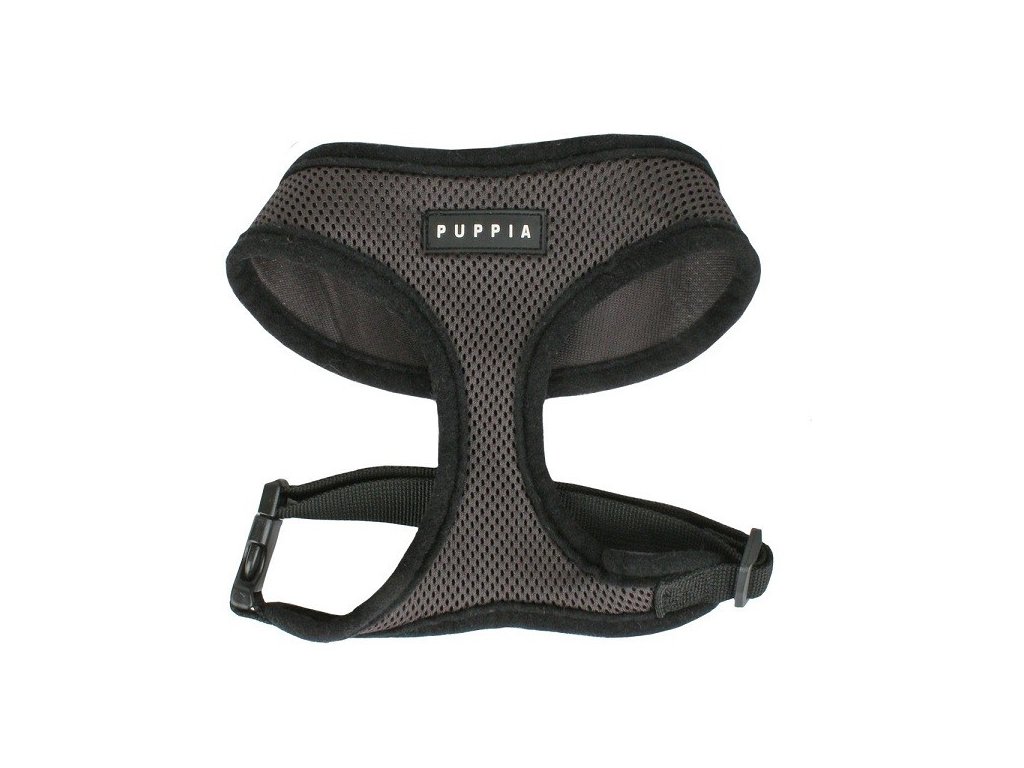 Elegantní kšíry pro psy zn. Puppia jsou šedočerné barvy. Kšíry pro pejsky jsou prodyšné a velice pohodlné, protože kvůli materiálu z měkkých vláken pejsky vůbec neškrtí.
